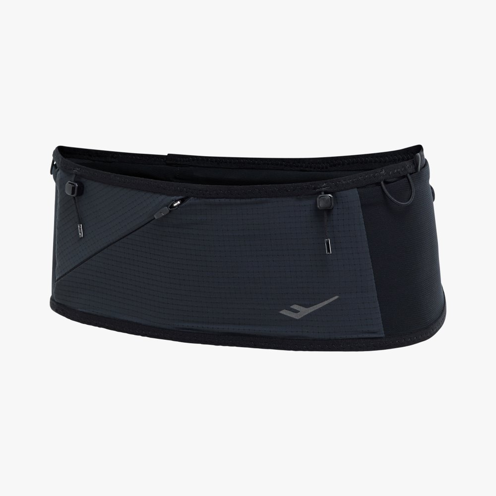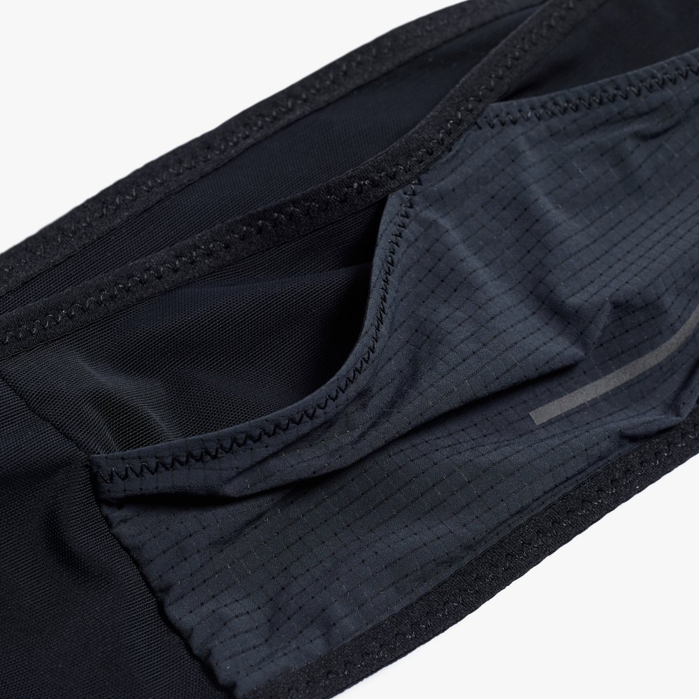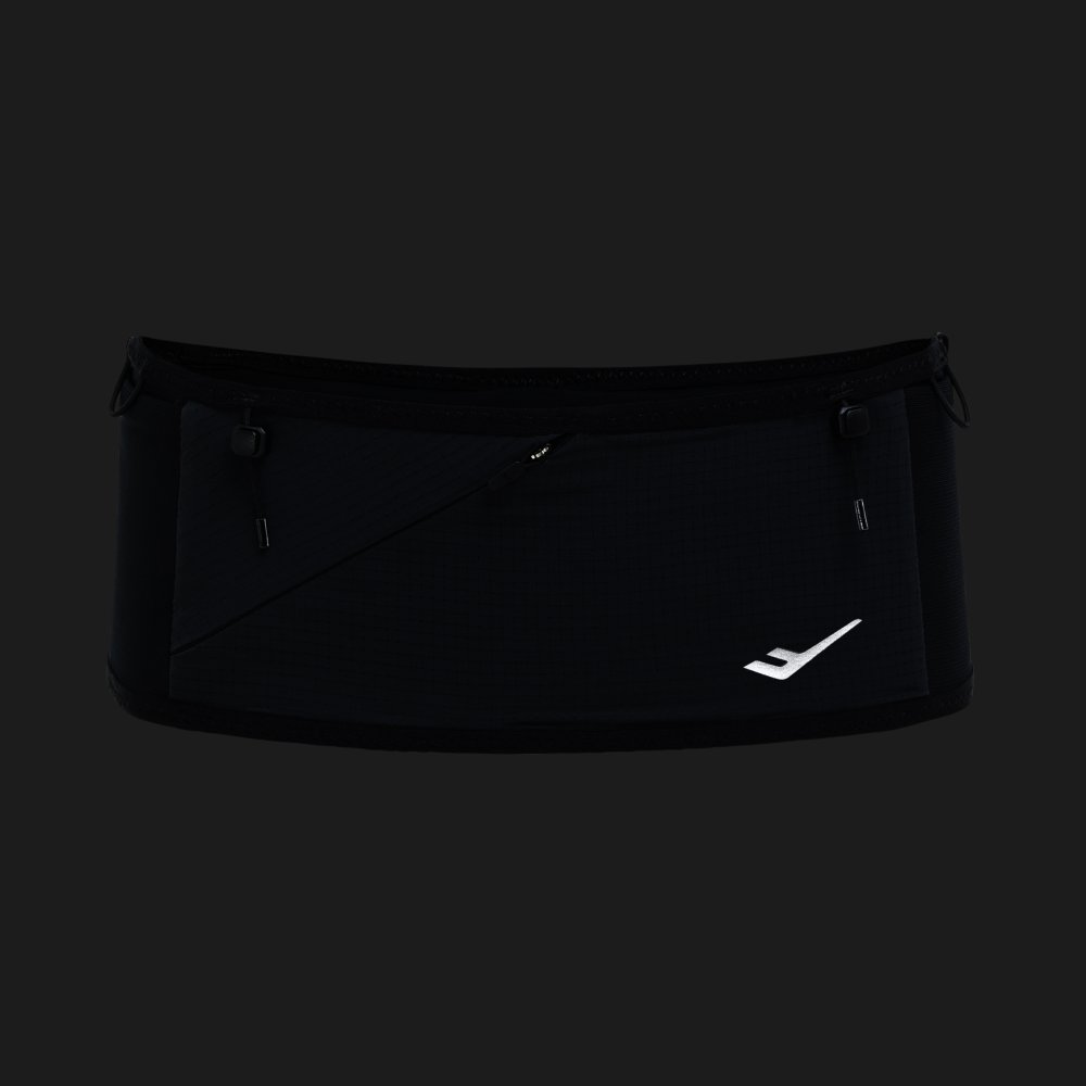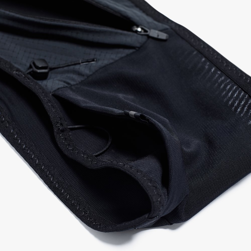 경량 메쉬 소재로 제작된 러닝 벨트로, 지퍼 포켓과 오픈 포켓 구성으로 수납력을 높였으며 배번 고정 스트링과 리플렉티브 디테일로 실용성과 가시성을 더한 아이템입니다.
